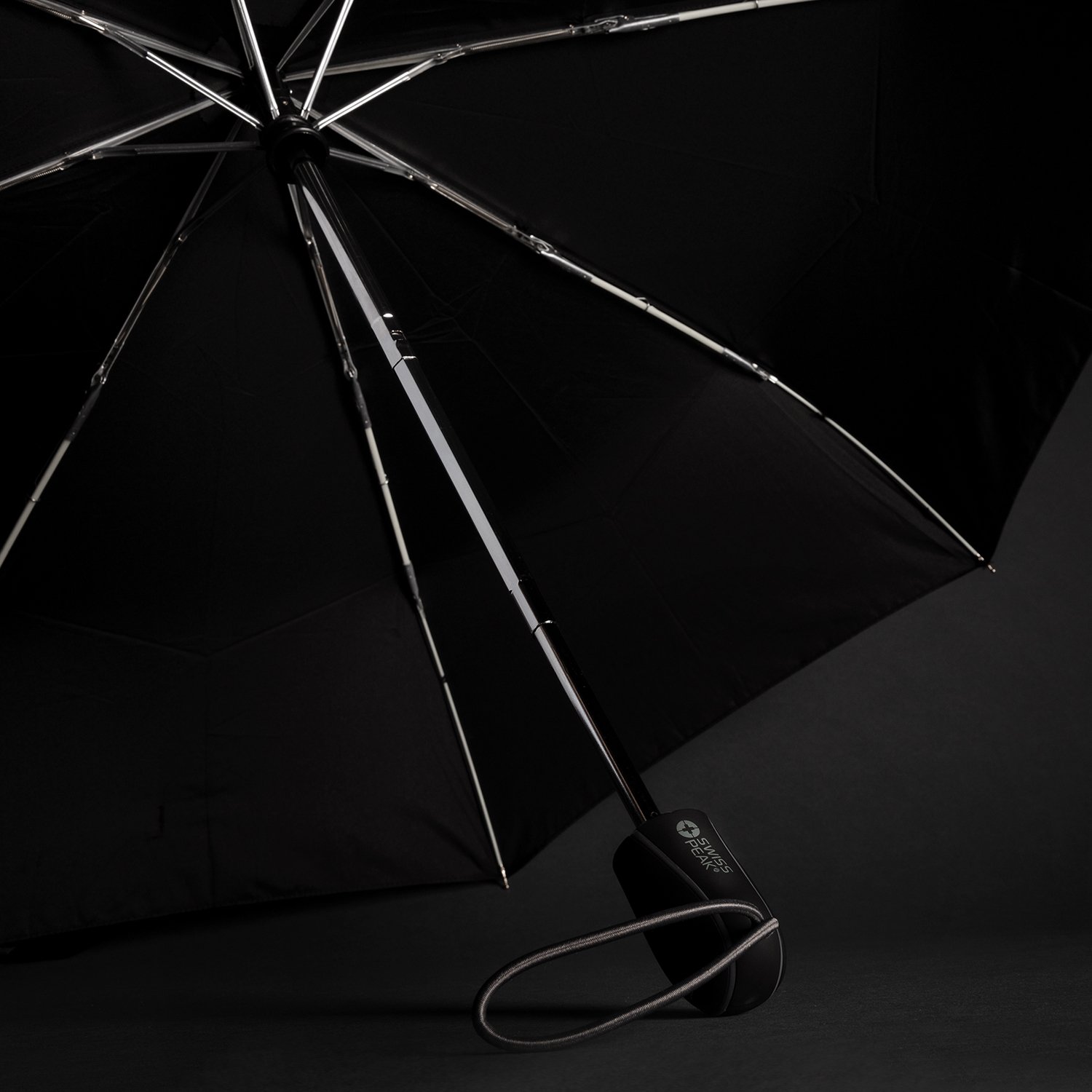 Swiss Peak Traveller Umbrella Stay dry in style with this compact three-stage Swiss Peak folding umbrella with automatic opening and closing. It has an eight-panel, 190T showerproof pongee canopy which is supported by 53cm fibreglass ribs and a fibreglass shaft with a chrome finish.
