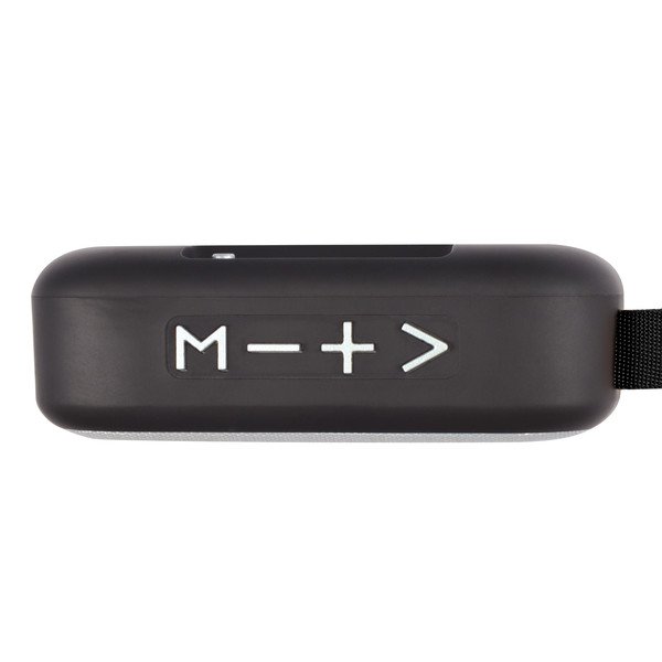 Jive Speaker Elevate your music experience with the Jive Speaker, a compact Bluetooth speaker designed for convenience and performance. Sync it easily with your phone or other devices to enjoy crystal-clear audio. With a 3W output, FM radio function, and slots for Micro SD cards and USB drives, it offers versatile playback options. Enjoy up to 6 hours of music wirelessly within a 10-metre range. The speaker charges quickly with the included USB cable and comes with a user guide. Its sleek design features a white grill, black shell, and silver controls.
